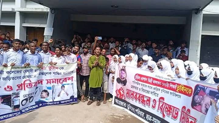 কুমিল্লার বুড়িচং উপজেলার এরশাদ ডিগ্রি কলেজের মেধাবী ছাত্র ও বাহেরচর গ্রামের মোসলেহ উদ্দিনের ছেলে তুহিন হত্যার ঘটনায় জড়িত ইতালি প্রবাসী সাইফুল ইসলাম বাবুসহ অন্যান্য আসামিদের দ্রুত গ্রেফতার ও দৃষ্টান্তমূলক শাস্তির দাবিতে এলাকাবাসী ও শিক্ষার্থীরা বিক্ষোভ মিছিল, মানববন্ধন ও স্মারকলিপি প্রদান করেছে। (২৮ অক্টোবর) মঙ্গলবার দুপুর ও বিকেলে পৃথক স্থানে বুড়িচং উপজেলা সদরে এই কর্মসূচি অনুষ্ঠিত হয়। পরে উপজেলা নির্বাহী কর্মকর্তা (ইউএনও) মোঃ তানভীর হোসেনের কাছে স্মারকলিপি প্রদান করা হয়। স্মারকলিপি গ্রহণকালে ইউএনও তানভীর হোসেন বলেন, “এই হত্যাকাণ্ডের ঘটনায় জড়িতদের দ্রুত গ্রেফতারের জন্য আমরা সার্বক্ষণিকভাবে বুড়িচং থানার কর্মকর্তাদের সঙ্গে যোগাযোগ রাখছি।” জানা যায়, একই ইউনিয়নের গোবিন্দপুর গ্রামের ইতালি প্রবাসী ও প্রভাবশালী আওয়ামী লীগ নেতা মো. সাইফুল ইসলাম বাবুর মেয়ে নিহা (ছদ্মনাম) ও উজ্জল নামে এক যুবক পালিয়ে বিয়ে করেন। পরে পুলিশ দিয়ে তাদের ধরে আনা হয়। কিছুদিন পর উজ্জলের বন্ধু তুহিনের সঙ্গে মেয়েটির পুনরায় সম্পর্কের সন্দেহে গত ২০ অক্টোবর রাত সাড়ে ৮টার দিকে পীরযাত্রাপুর ইউনিয়নের শ্রীপুর গ্রামের কামাল মিয়ার বাড়ির সামনে থেকে তুহিনকে জোরপূর্বক গাড়িতে তুলে নেয় মেয়ের বাবা সাইফুল ইসলাম বাবু ও তার সহযোগীরা। অভিযুক্তরা তুহিনকে নির্মমভাবে মারধর করে গুরুতর জখম করে। স্থানীয়রা তাকে উদ্ধার করে প্রথমে বুড়িচং উপজেলা স্বাস্থ্য কমপ্লেক্স, পরে কুমিল্লা মেডিকেল কলেজ হাসপাতাল ও অবশেষে ঢাকার আনোয়ার খান মেডিকেল কলেজ হাসপাতালে ভর্তি করে। সেখানে সাতদিন লাইফ সাপোর্টে থাকার পর সোমবার (২৭ অক্টোবর) বেলা ১১টার দিকে তুহিনের মৃত্যু হয়। মঙ্গলবার সন্ধ্যায় তুহিনের লাশ নিজ বাড়িতে আনা হয়েছে । এদিকে, গত ২০ অক্টোবর তুহিনের মা ফেরদৌসী আক্তার বুড়িচং থানায় ইতালি প্রবাসী সাইফুল ইসলাম বাবুসহ চারজনকে অভিযুক্ত করে অভিযোগ দায়ের করেন। অন্যান্য অভিযুক্তরা হলেন—নাফিজ উদ্দিন, জহির মিয়া ও আবদুল আলিম। স্থানীয়দের দাবি,পুলিশের গাফিলতি থাকার কারণে আসামি এখানো গ্রেপ্তার হয়নি।তারা দ্রুত সকল আসামিকে গ্রেফতার করে দৃষ্টান্তমূলক শাস্তি নিশ্চিত করার জন্য প্রশাসনের নিকট দাবি জানান।