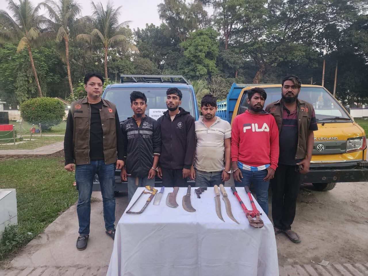 কুমিল্লা জেলা ডিবি পুলিশ, চান্দিনা, সদর দক্ষিণ, লালমাই ও লাকসাম থানার সমন্বিত টিমের অভিযানে আন্তঃজেলা ডাকাত চক্রের অন্যতম প্রধান নয়নসহ ৫ জন ডাকাতকে গ্রেফতার করা হয়েছে। এসময় ডাকাতির কাজে ব্যবহৃত দেশীয় অস্ত্র, সরঞ্জাম ও দুটি পিকআপ গাড়ি উদ্ধার করা হয়। পাশাপাশি লাকসাম থানা এলাকা থেকে ডাকাতি হওয়া ৩টি গরু ও ২টি গরুর বাছুরও উদ্ধার করা হয়েছে। পুলিশের সূত্রে জানা যায়, সম্প্রতি জেলার বিভিন্ন প্রান্তিক এলাকায় ধারাবাহিক ডাকাতির ঘটনায় আইনশৃঙ্খলা পরিস্থিতি নিয়ন্ত্রণে জেলা পুলিশ সুপারের নির্দেশনায় টহল জোরদার, অতিরিক্ত চেকপোস্ট স্থাপন ও গোয়েন্দা নজরদারি বৃদ্ধি করা হয়। এরই ধারাবাহিকতায় গত ২৫ নভেম্বর গোপন সংবাদের ভিত্তিতে জানা যায়, চান্দিনা থানার বরকরই নাথের বাড়ী এলাকায় একটি সংঘবদ্ধ ডাকাত দল ডাকাতির প্রস্তুতি নিচ্ছে। অতিরিক্ত পুলিশ সুপার (ক্রাইম অ্যান্ড অপারেশনস)-এর নেতৃত্বে অপারেশনাল টিম অভিযান পরিচালনা করে। পুলিশের উপস্থিতি টের পেয়ে ডাকাতরা পালানোর চেষ্টা করলে নীল রঙের পিকআপ থেকে ৪/৫ জন পালিয়ে গেলেও ঘটনাস্থল থেকে ৪ জনকে আটক করা হয়। অপর একটি হলুদ রঙের পিকআপ পালিয়ে যাওয়ার সময় ধাওয়া করলে ডাকাত নয়ন পুলিশ সদস্যদের ওপর গাড়ি তুলে মারার চেষ্টা করে। দীর্ঘ প্রায় দেড় ঘণ্টার দুঃসাহসিক ধাওয়ার পর সদর দক্ষিণ থানার ফিরিঙ্গির হাট এলাকায় ডাকাত নয়ন কৌশলে পালানোর চেষ্টা করে পুকুরে লাফ দিলে ডিবি পুলিশের সদস্যরা পুকুরে নেমে তাকে গ্রেফতার করতে সক্ষম হন। গ্রেফতারকৃতরা সাম্প্রতিক সময়ের লাকসাম ও চান্দিনা এলাকায় গরু ডাকাতির ঘটনায় নিজেদের সম্পৃক্ততার কথা স্বীকার করেছে। গ্রেফতারকৃতরা হলেন: চান্দিনা থানার বরকড়ই গ্রামের তাজুল ইসলামের ছেলে মোঃ রায়হান (২০), তিতাস থানার দক্ষিণ নারান্দিয়া গ্রামের মোহাম্মদ আলীর ছেলে মোঃ নয়ন (৩৪), চান্দিনা থানার বরকড়ই গ্রামের মৃত মনির হোসেনের ছেলে মোঃ শাহাদাত হোসেন (২৪), চান্দিনা থানার দেওকামতা গ্রামের মোঃ সিরাজ কাজীর ছেলে মোঃ নাছির (২৫), চান্দিনা থানার সুরিখোলা গ্রামের মন্টু মিয়ার ছেলে মোঃ সজীব রানা (২৮)। পুলিশ সূত্র জানায়, নয়নের বিরুদ্ধে ১১টি, সজীবের বিরুদ্ধে ৫টি এবং রায়হানের বিরুদ্ধে ১টি মামলা রয়েছে। এসময় তাদের কাছ থেকে ২টি রেজিস্ট্রেশনবিহীন পিকআপ, ১টি টোটো রিভাল বার, ১টি বোল্ট কাটার, ২টি কাঠের বাটযুক্ত ছুরি, লোহার চাপাতি, ১টি স্টিলের চাপাতি, ১টি হ্যাকসো ব্লেড কাটার, ৩টি গরু ও ২টি বাছুর উদ্ধার করা হয়। পুলিশ জানিয়েছে, ডাকাত চক্রের অন্যান্য সদস্যদের গ্রেফতারে দেবিদ্বার ও দাউদকান্দি এলাকায় অভিযান অব্যাহত রয়েছে। জেলা পুলিশ সুপার বলেন, “অপরাধ দমনে জেলা পুলিশের এমন সমন্বিত অভিযান অব্যা