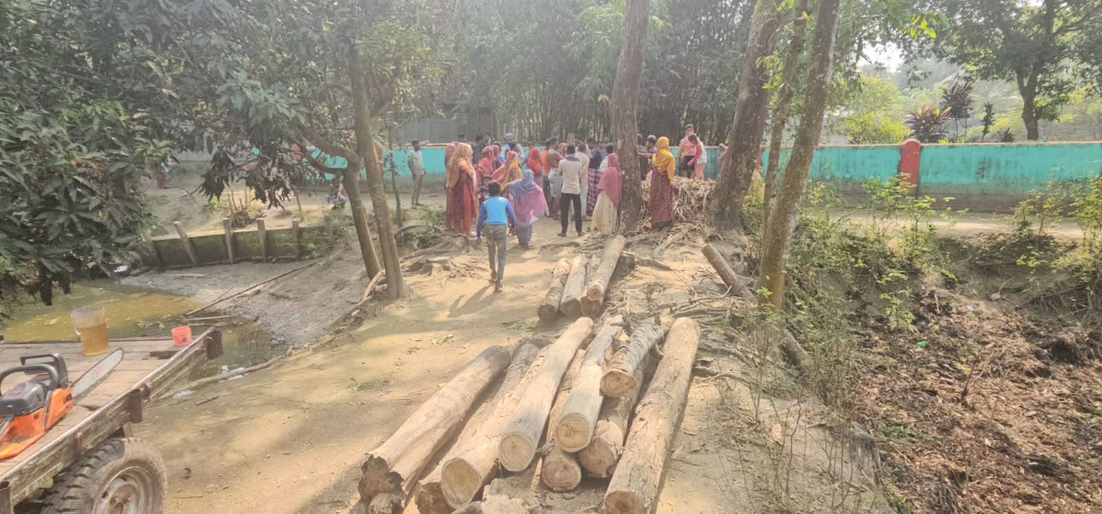 দায়িত্বপ্রাপ্ত অফিসার এএসআই কামরুজ্জামান বলেন, “অভিযোগ পাওয়ার পর ঘটনাস্থলে গিয়ে দেখি কিছু লোক গাছ কাটছে। দুই পক্ষকেই পরবর্তী নির্দেশ না দেওয়া পর্যন্ত কাজ বন্ধ রাখতে বলা হয়েছে।”