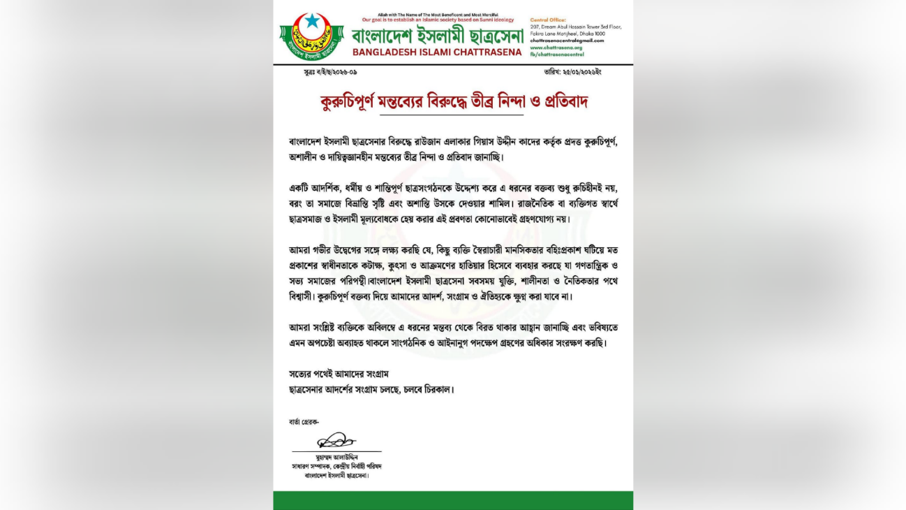 বাংলাদেশ ইসলামী ছাত্রসেনা কেন্দ্রীয় নির্বাহী পরিষদের সাধারণ সম্পাদক মুহাম্মদ আলাউদ্দিন স্বাক্ষরিত দলীয় প্যাডে এ তীব্র নিন্দা ও প্রতিবাদ জানানো হয়।