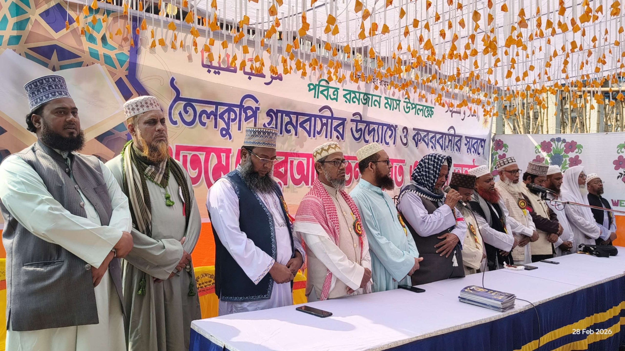 শনিবার (২৮ ফেব্রুয়ারি ২০২৬) দুপুরে তৈলকুপি গ্রামবাসীর উদ্যোগে আয়োজিত এ অনুষ্ঠানে জেলার বিভিন্ন এলাকার ৫৩ জন খতিব ও আলেম-ওলামা অংশগ্রহণ করেন। তারা খতমে কোরআন তেলাওয়াত শেষে কবরবাসীদের রূহের মাগফিরাত ও দেশের শান্তি-সমৃদ্ধি কামনায় বিশেষ দোয়া ও মোনাজাত করেন।