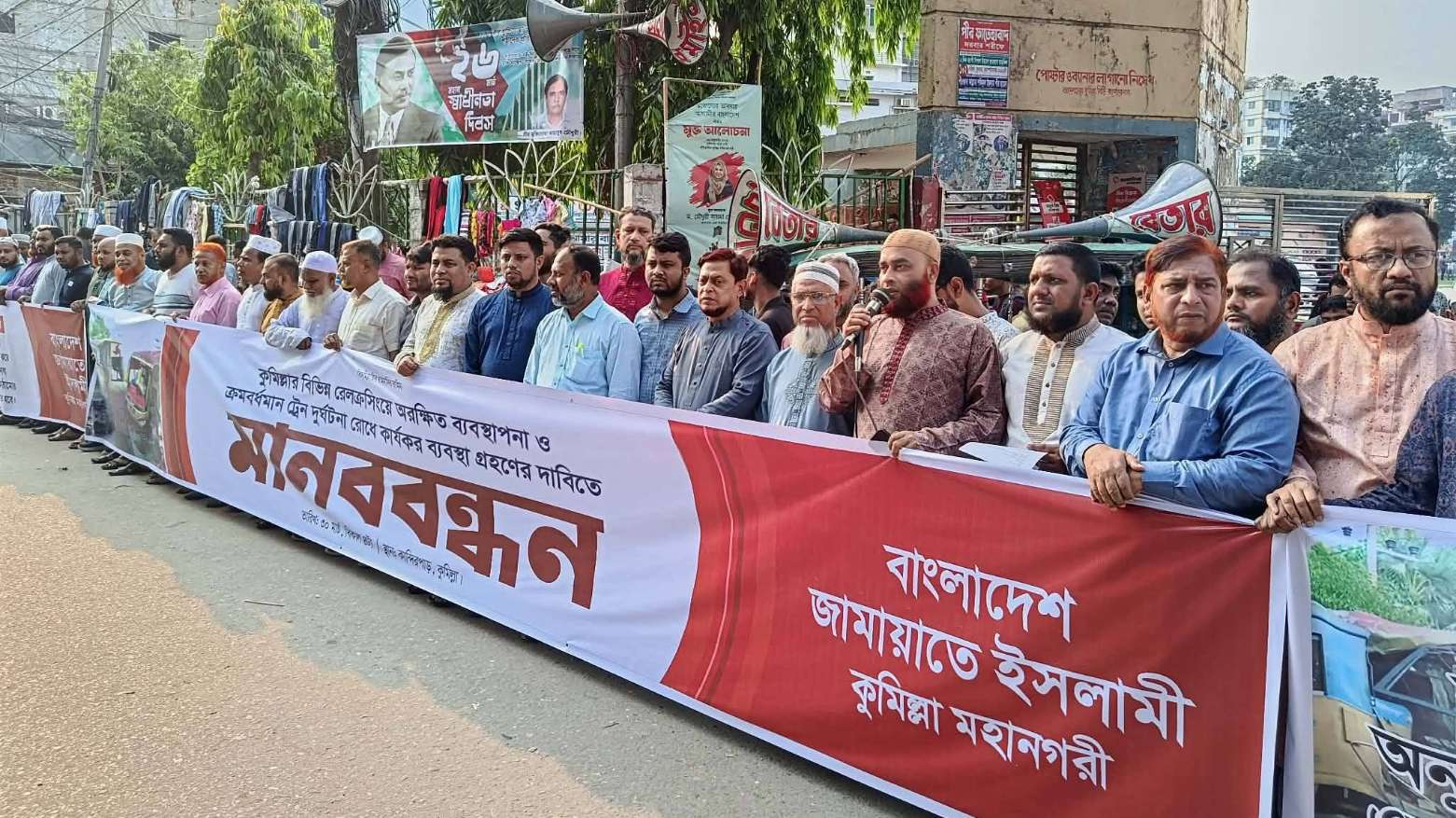 কুমিল্লার বিভিন্ন অরক্ষিত রেলক্রসিংয়ে দুর্ঘটনা রোধে কার্যকর পদক্ষেপ নেওয়ার দাবিতে মানববন্ধন ও স্মারকলিপি প্রদান কর্মসূচি পালন করেছে বাংলাদেশ জামায়াতে ইসলামী কুমিল্লা মহানগরী।