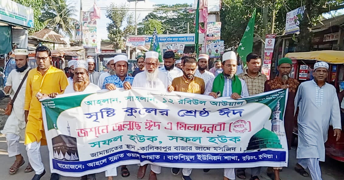 কুমিল্লার বুড়িচং উপজেলার বাকশীমুল ইউনিয়নের কালিকাপুর বাজারে আহলে সুন্নাত ওয়াল জামায়াতের উদ্যোগে পবিত্র ঈদে মিলাদুন্নবী (সা.) উদযাপন উপলক্ষে এক আলোচনা সভা ও র্যালি অনুষ্ঠিত হয়েছে। বৃহস্পতিবার (৪ সেপ্টেম্বর) বাদ আসর আয়োজিত এ অনুষ্ঠানটি স্থানীয় ওলামায়ে কেরাম, জনপ্রতিনিধি, সমাজসেবী, সাংবাদিকসহ বিভিন্ন শ্রেণি-পেশার মানুষের মিলনমেলায় পরিণত হয়। র্যালি ও আলোচনা সভায় বক্তারা বলেন, ঈদে মিলাদুন্নবী (সা.) মুসলমানদের জীবনে এক পবিত্র আনন্দের দিন। এটি কেবল আনন্দ উৎসব নয়, বরং রাসূলুল্লাহ (সা.)-এর আদর্শ বাস্তবায়নের অঙ্গীকারের দিন। এ আয়োজনের মাধ্যমে নতুন প্রজন্মের মাঝে সীরাত ও সুন্নতের প্রতি ভালোবাসা জাগ্রত হবে বলে তাঁরা মত প্রকাশ করেন। বক্তারা আরও বলেন, ঈদে মিলাদুন্নবী (সা.) মুসলিম উম্মাহর জন্য অনন্য ও তাৎপর্যপূর্ণ দিন, যা আমাদেরকে রাসূলে পাক (সা.)-এর আদর্শ অনুসরণে উদ্বুদ্ধ করে। তাই এ কর্মসূচি সুশৃঙ্খল, সুন্দর ও যথাযোগ্য মর্যাদায় পালনের ওপর গুরুত্বারোপ করা হয়। আলোচনা সভা, দোয়া মাহফিল ও র্যালিতে উপস্থিত ছিলেন— বাকশীমুল ইউনিয়ন আহলে সুন্নাত ওয়াল জামায়াতের সভাপতি অধ্যক্ষ মাওলানা মুফতি কাজী আবুল বাশার, সাধারণ সম্পাদক মাওলানা তাজুল ইসলাম ভুঁইয়া, অর্থ সম্পাদক প্রভাষক কাজী মোঃ আল ইমরান, সাবেক ইউপি চেয়ারম্যান জামশেদ আলম, কুমিল্লা দক্ষিণ জেলা যুবদলের যুগ্ম আহ্বায়ক মোঃ এনামুল হক সবুজ, বুড়িচং উপজেলা যুবদলের যুগ্ম আহ্বায়ক মোঃ রহিম খান লিটন, মোঃ বিল্লাল হোসেন, উপজেলা ছাত্রদলের সিনিয়র যুগ্ম আহ্বায়ক মোঃ জালাল উদ্দীন, যুগ্ম আহ্বায়ক তানজীবুর রহমান শুভ, ইউনিয়ন স্বেচ্ছাসেবক দলের সাধারণ সম্পাদক মোঃ কামাল হোসেন, লিটন মেম্বার, হাফেজ মাওলানা শাহাদাত সারোয়ার, কাজী নুরুল ইসলাম, কাজী মুমিনুল ইসলাম, মাহবুব রহমান, মোতাহার হোসেন, শাহীনুল ইসলাম, হাফেজ মোশাররফ হোসেন, বাকশীমুল সরকারি প্রাথমিক বিদ্যালয়ের প্রধান শিক্ষক মোঃ জাহাঙ্গীর আলম, মাওলানা মুফতি ফাহাদ, এমদাদুল হক, আবদুর রউফসহ আরও অনেকে। সভা শেষে মিলাদ শরীফ, ক্বিয়াম ও বিশেষ মোনাজাত অনুষ্ঠিত হয়। এ সময় বিশ্ব মুসলিম উম্মাহর শান্তি, দেশের কল্যাণ এবং সকলের হেদায়েত কামনা করে দোয়া করা হয়।