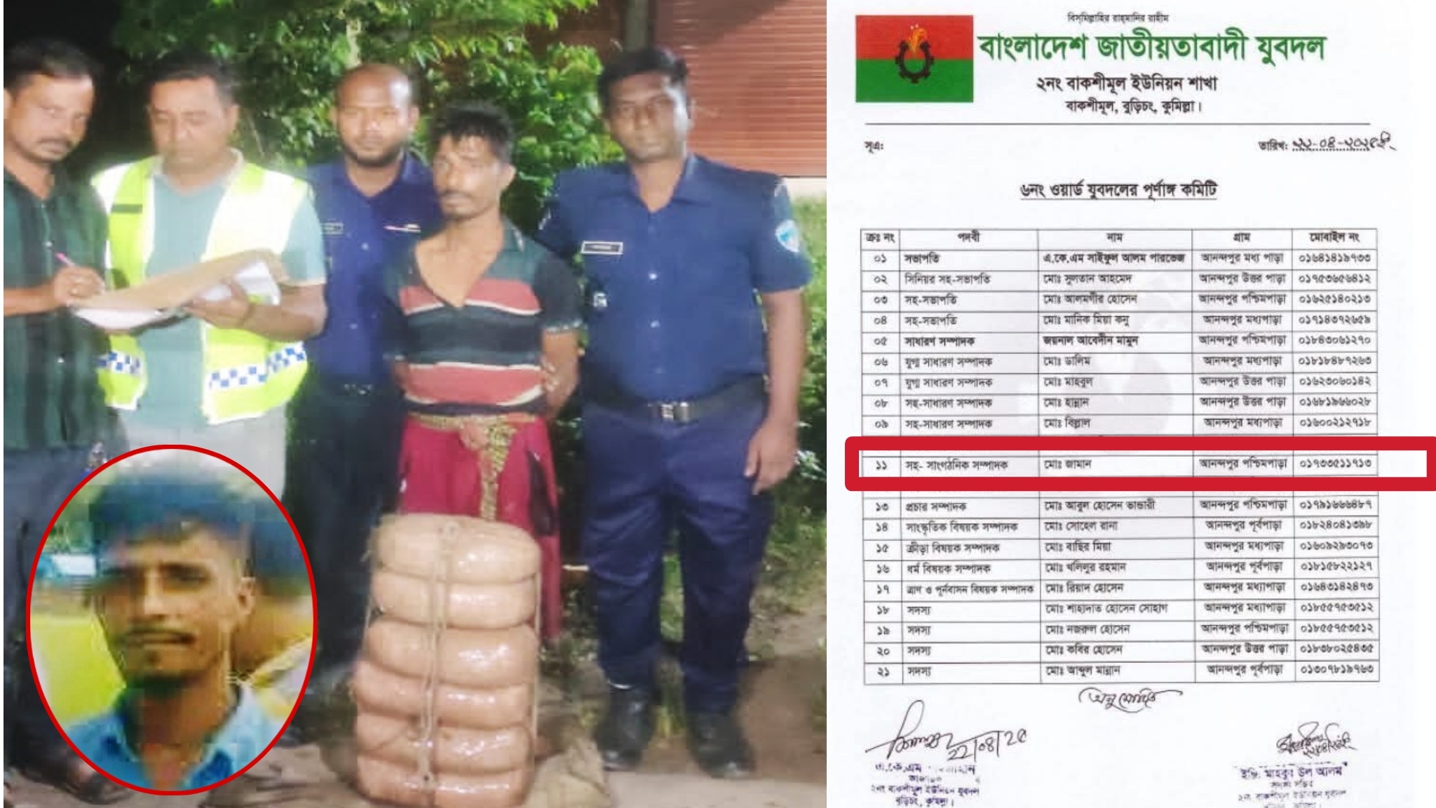 কুমিল্লার বুড়িচং উপজেলার কালিকাপুর বাজার থেকে ১২ কেজি গাঁজাসহ যুবদল নেতা জামান হোসেন (৩৪) কে আটক করেছে পুলিশ। সোমবার (২২ সেপ্টেম্বর) রাত ৯টার দিকে নিয়মিত মাদকবিরোধী অভিযানে তাকে আটক করা হয়। বিষয়টি মঙ্গলবার (২৩ সেপ্টেম্বর) দুপুরে নিশ্চিত করেছেন বুড়িচং থানার ভারপ্রাপ্ত কর্মকর্তা (ওসি) আজিজুল হক। পুলিশ তালাশ বাংলাকে জানায়, গোপন সংবাদের ভিত্তিতে এসআই রাকিবুল হাছান, এএসআই শাহপরান ও সঙ্গীয় ফোর্স অভিযান চালান। এসময় কালিকাপুর বাজারে শ্রীমন্তপুর প্রবাসী মনির হোসেনের বাড়ির সামনে বাগড়া-কুমিল্লা সড়কে গাড়ির জন্য অপেক্ষারত অবস্থায় জামানকে আটক করা হয়। তবে অভিযানের সময় জামানের ভাই সুমন পালিয়ে যায়। আটককৃত জামান হোসেন বাকশীমূল ইউনিয়নের আনন্দপুর পশ্চিমপাড়া গ্রামের আব্দুল হামিদের ছেলে এবং ইউনিয়ন যুবদল কমিটির সহ-সাংগঠনিক সম্পাদক। পুলিশ জানায়, তার বিরুদ্ধে আগে থেকেই একটি ধর্ষণ মামলা রয়েছে। স্থানীয়দের দাবি, জামান দীর্ঘদিন ধরে ভারত থেকে মাদকসহ বিভিন্ন পণ্য ক্রয় করে দেশের বিভিন্ন স্থানে পাচার করে আসছিলেন। ওসি আজিজুল হক তালাশ বাংলাকে বলেন, “আটক জামানের বিরুদ্ধে মাদকদ্রব্য নিয়ন্ত্রণ আইনের ৩৬(১) এর ১৯(খ) ধারায় মামলা দিয়ে আদালতের মাধ্যমে জেলহাজতে প্রেরণ করা হয়েছে। মাদকবিরোধী অভিযান অব্যাহত থাকবে।”