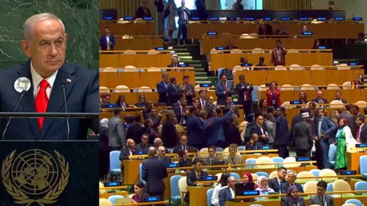 জাতিসংঘ সাধারণ পরিষদে শুক্রবার (২৬ সেপ্টেম্বর) ইসরায়েলি প্রধানমন্ত্রী বেনিয়ামিন নেতানিয়াহুর ভাষণ চলাকালে গাজায় চলমান গণহত্যা এবং মধ্যপ্রাচ্যের একাধিক দেশে ইসরায়েলের বার বার হামলার প্রতিবাদে অসংখ্য কূটনীতিক ওয়াক আউট করেছেন। নেতানিয়াহু মঞ্চে উঠতেই বহু প্রতিনিধি দ্রুত হল থেকে বেরিয়ে যান। গত বছরের মতো এবারও একই ধরনের প্রতিবাদের পুনরাবৃত্তি ঘটলো। এই ওয়াক আউটের ফলে একসঙ্গে অনেকেই বেরিয়ে যাওয়ায় বেরোনোর পথে লম্বা লাইন তৈরি হয়।তবে এর মধ্যেই মার্কিন প্রতিনিধিদল নেতানিয়াহুকে করতালি দেয়। নেতানিয়াহু সেই সময় নীরবে দাঁড়িয়ে থাকেন। হলে উপস্থিত ব্রাজিলীয় প্রতিনিধিদলকে ঐতিহ্যবাহী ফিলিস্তিনি কেফিয়াহ পরে থাকতে দেখা যায়। গত এক সপ্তাহ ধরে জাতিসংঘে ফিলিস্তিনি কর্তৃপক্ষের মিশন বিভিন্ন বিশ্বনেতাকে চিঠি পাঠিয়ে নেতানিয়াহুর ভাষণ বর্জনের আহ্বান জানিয়েছিল এবং তাকে ‘যুদ্ধাপরাধী’ হিসেবে আখ্যায়িত করেছিল। ২০২৪ সালের নভেম্বরে আন্তর্জাতিক অপরাধ আদালত গাজায় ২০২৩ সালের অক্টোবর থেকে সংঘটিত যুদ্ধাপরাধ ও মানবতার বিরুদ্ধে অপরাধের দায়ে নেতানিয়াহুর বিরুদ্ধে গ্রেপ্তারি পরোয়ানা জারি করে। ইসরায়েলের তথাকথিত গণহত্যামূলক অভিযানে এখন পর্যন্ত দুই লাখ ৩৮ হাজারেরও বেশি ফিলিস্তিনি নিহত, আহত বা নিখোঁজ হয়েছেন। ইসরায়েলি সামরিক গোয়েন্দা তথ্যের ভিত্তিতে সাম্প্রতিক প্রতিবেদনে বলা হয়েছে, এ বছরের মে মাস পর্যন্ত নিহতদের ৮০ শতাংশেরও বেশি ছিলেন বেসামরিক মানুষ। প্রায় গোটা জনগোষ্ঠী অন্তত একবার করে ঘরবাড়ি ছেড়ে পালিয়েছে। ঘরবাড়ি, স্কুল ও হাসপাতালগুলো প্রতিদিনের বিমান হামলা এবং ট্যাংকের গোলাবর্ষণে ধ্বংসস্তূপে পরিণত হয়েছে।
