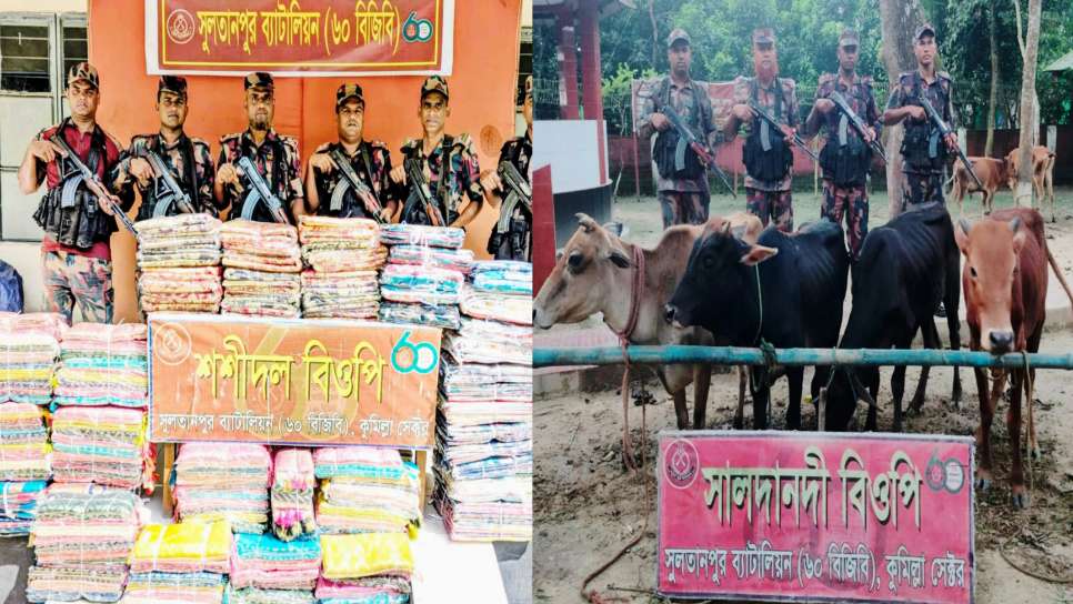 কুমিল্লার বুড়িচং-ব্রাহ্মণপাড়া ও ব্রাহ্মণবাড়িয়া সীমান্ত এলাকায় বিশেষ অভিযান পরিচালনা করে প্রায় দুই কোটি টাকা মূল্যের ভারতীয় বিভিন্ন প্রকার পণ্য জব্দ করেছে সুলতানপুর ব্যাটালিয়ন (৬০ বিজিবি)। (৬ অক্টোবর) সোমববার দুপুরে এ বিষয়টি নিশ্চিত করেছেন সুলতানপুর ব্যাটালিয়ন (৬০ বিজিবি) অধিনায়ক ও পরিচালক লেঃ কর্নেল মোঃ জিয়াউর রহমান। তিনি জানান,গত (১ থেকে ৬ অক্টোবর ২০২৫) তারিখ পর্যন্ত সুলতানপুর ব্যাটালিয়নের দায়িত্বপূর্ণ এলাকার ব্রাহ্মণবাড়িয়া জেলার আখাউড়া, কসবা, মঈনপুর, খাদলা, মাদলা ও চন্ডিদার বিওপি এবং কুমিল্লা জেলার ব্রাহ্মণপাড়া উপজেলার সালদানদী, শশীদল।বুড়িচং উপজেলার সংকুচাইল, খারেরা,কুমিল্লা সদর বড়জ্বালা বিওপি সীমান্তবর্তী এলাকায় চোরাচালান বিরোধী বিশেষ অভিযান পরিচালনা করা হয়। এসময় বিজিবি সদস্যরা মোট ১,৮৩,৪৬,১৩২ টাকা (এক কোটি তিরাশী লক্ষ ছেচল্লিশ হাজার একশত বত্রিশ) মূল্যের অবৈধ ভারতীয় পণ্য জব্দ করে। এসব পণ্যের মধ্যে রয়েছে— অরিও বিস্কুট, ফুচকা, বাসমতি চাল, গরু, শাড়ি, রেডবুল এনার্জি ড্রিংকস, স্কিন সাইন ক্রিম, ইস্কাফ সিরাপ, মেহেদী, হেলফিট ওষুধ, নেভিয়া বডি লোশন, রিংগার্ড ক্রিম, মোভ স্প্রে, ডেইরি মিল্ক ও ডার্ক চকলেট, সিএনজি, বাঁজি, তাস, ডাবর আমলা তেল, ইঁদুর মারার ওষুধ, লোহার কাঁচি ও কুচ, কাঠের আচাড়ী, চুলের মেহেদী পাউডার, চুলের কালো কলপ, খুর, চুল কাটার কেঁচি, ক্লিপ, ফেসওয়াস, বীজ, চিপস, পিকআপ, ডাব সাবান, বডি স্প্রে ও টুথপেস্ট ইত্যাদি। জব্দকৃত সকল মালামাল যথাযথ প্রক্রিয়ার মাধ্যমে আখাউড়া ও কুমিল্লা কাস্টমস অফিসে জমা করা হবে বলে বিজিবি জানিয়েছে। সীমান্তে নিরাপত্তা জোরদার ও চোরাচালান প্রতিরোধে ৬০ বিজিবির আভিযানিক কার্যক্রম ও গোয়েন্দা তৎপরতা অব্যাহত রয়েছে। এরই ধারাবাহিকতায় এসব অভিযান চালিয়ে বিপুল পরিমাণ অবৈধ পণ্য জব্দ করা হয়েছে।