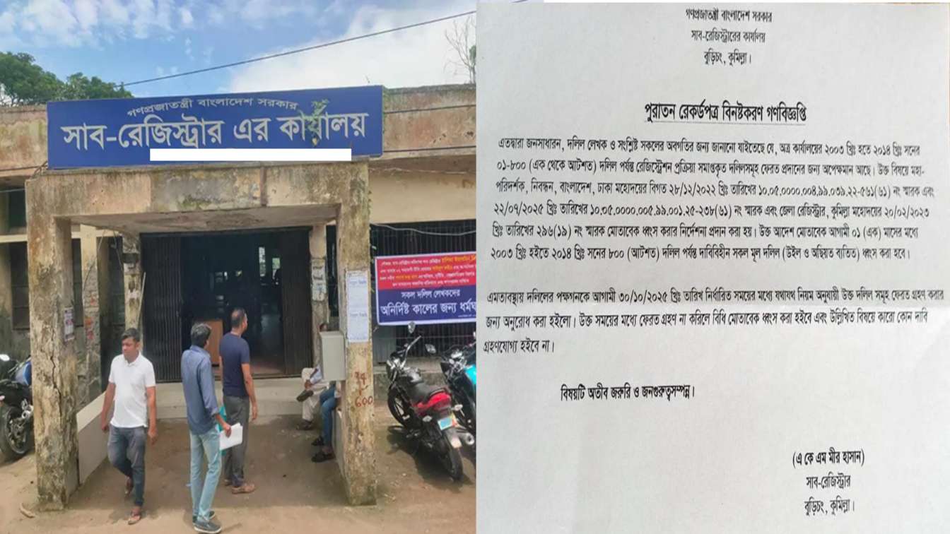 কুমিল্লার বুড়িচং উপজেলা সাব-রেজিস্ট্রার কার্যালয় ২০০৩ থেকে ২০১৪ সালের পুরাতন রেকর্ডপত্র বিনষ্ট করার বিষয়ে একটি গণবিজ্ঞপ্তি জারি করেছে। বিজ্ঞপ্তিতে জানানো হয়েছে, উক্ত সময়ের মধ্যে রেজিস্ট্রেশন প্রক্রিয়া সম্পন্নকৃত ০১ থেকে ৮০০ নম্বর পর্যন্ত দলিলসমূহ ফেরত প্রদানের জন্য অপেক্ষমান রয়েছে। মহাপরিদর্শক (নিবন্ধন), বাংলাদেশ, ঢাকা এবং জেলা রেজিস্ট্রার, কুমিল্লা কর্তৃক জারিকৃত নির্দেশনার আলোকে এই দলিলগুলো ধ্বংসের প্রক্রিয়া শুরু হচ্ছে। স্মারক অনুযায়ী আগামী ৩০ অক্টোবর ২০২৫ খ্রিষ্টাব্দের মধ্যে সংশ্লিষ্ট পক্ষগণকে যথাযথ নিয়মে দলিলসমূহ ফেরত গ্রহণের অনুরোধ জানানো হয়েছে। নির্ধারিত সময়ের মধ্যে ফেরত গ্রহণ না করা হলে বিধি মোতাবেক দাবিবিহীন সকল মূল দলিল (উইল ও অছিয়ত ব্যতীত) ধ্বংস করা হবে বলে বিজ্ঞপ্তিতে উল্লেখ করা হয়েছে। গণবিজ্ঞপ্তিতে আরও বলা হয়েছে, নির্ধারিত সময় অতিক্রান্ত হওয়ার পর কোনো দাবি গ্রহণযোগ্য হবে না। বিষয়টিকে অতীব জরুরি ও জনগুরুত্বসম্পন্ন হিসেবে উল্লেখ করেছেন বুড়িচং উপজেলা সাব-রেজিস্ট্রার এ কে এম মীর হাসান।