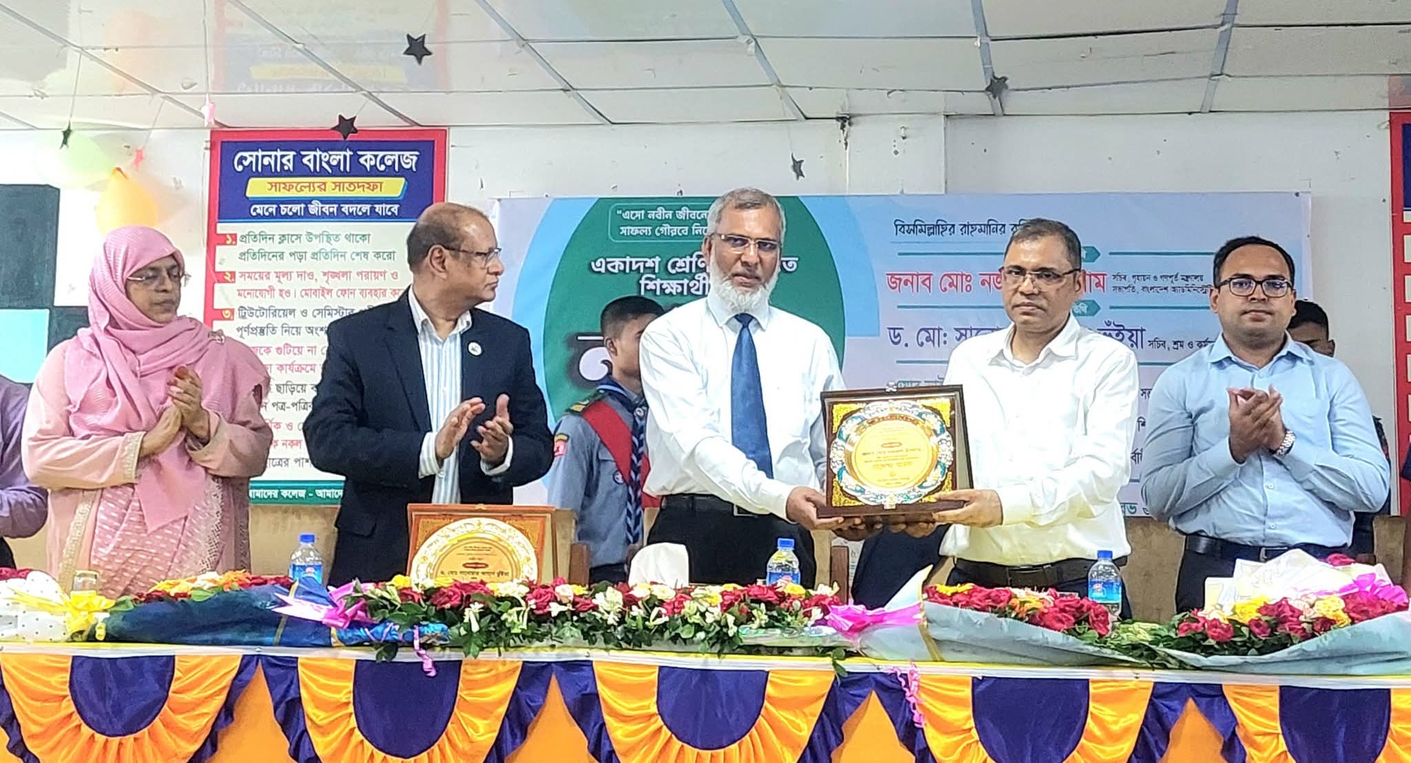 কুমিল্লার বুড়িচং উপজেলার সোনার বাংলা কলেজে উৎসবমুখর পরিবেশে অনুষ্ঠিত হয়েছে নবীন বরণ অনুষ্ঠান। নতুন শিক্ষার্থীদের বরণ করে নিতে কলেজ প্রাঙ্গণ মুখরিত হয়ে ওঠে শিক্ষক-শিক্ষার্থী ও অভিভাবকদের উপস্থিতিতে। অনুষ্ঠানে কলেজের অধ্যক্ষ আবু ছালেক মো. সেলিম রেজা সৌরভ এর সভাপতিত্বে ও প্রধান অতিথি হিসেবে উপস্থিত ছিলেন গণপ্রজাতন্ত্রী বাংলাদেশ সরকারের গৃহায়ন ও গণপূর্ত মন্ত্রণালয়ের মাননীয় সচিব ও বাংলাদেশ অ্যাডমিনিস্ট্রেটিভ সার্ভিস অ্যাসোসিয়েশনের সভাপতি মোঃ নজরুল ইসলাম। সম্মানিত অতিথি হিসেবে উপস্থিত ছিলেন শ্রম ও কর্মসংস্থান মন্ত্রণালয়ের মাননীয় সচিব ডক্টর সানোয়ার জাহান ভূঁইয়া। বিশেষ অতিথি ছিলেন কুমিল্লা শিক্ষা বোর্ডের পরীক্ষা নিয়ন্ত্রক প্রফেসর রুনা নাসরিন এবং বুড়িচং উপজেলা নির্বাহী অফিসার মোঃ তানভীর হোসেন। অনুষ্ঠানে অতিথিরা নবীন শিক্ষার্থীদের উদ্দেশে শুভেচ্ছা বক্তব্য প্রদান করেন এবং শিক্ষার পাশাপাশি নৈতিকতা, মানবিকতা ও দেশপ্রেমে উদ্বুদ্ধ হয়ে গড়ে ওঠার আহ্বান জানান। পরে সাংস্কৃতিক পরিবেশনা, কবিতা পাঠ, সংগীত ও নৃত্য পরিবেশনার মধ্য দিয়ে অনুষ্ঠানটি প্রাণবন্ত হয়ে ওঠে। শেষে অতিথিকে শুভেচ্ছা স্মারক প্রদান করা হয়েছে।